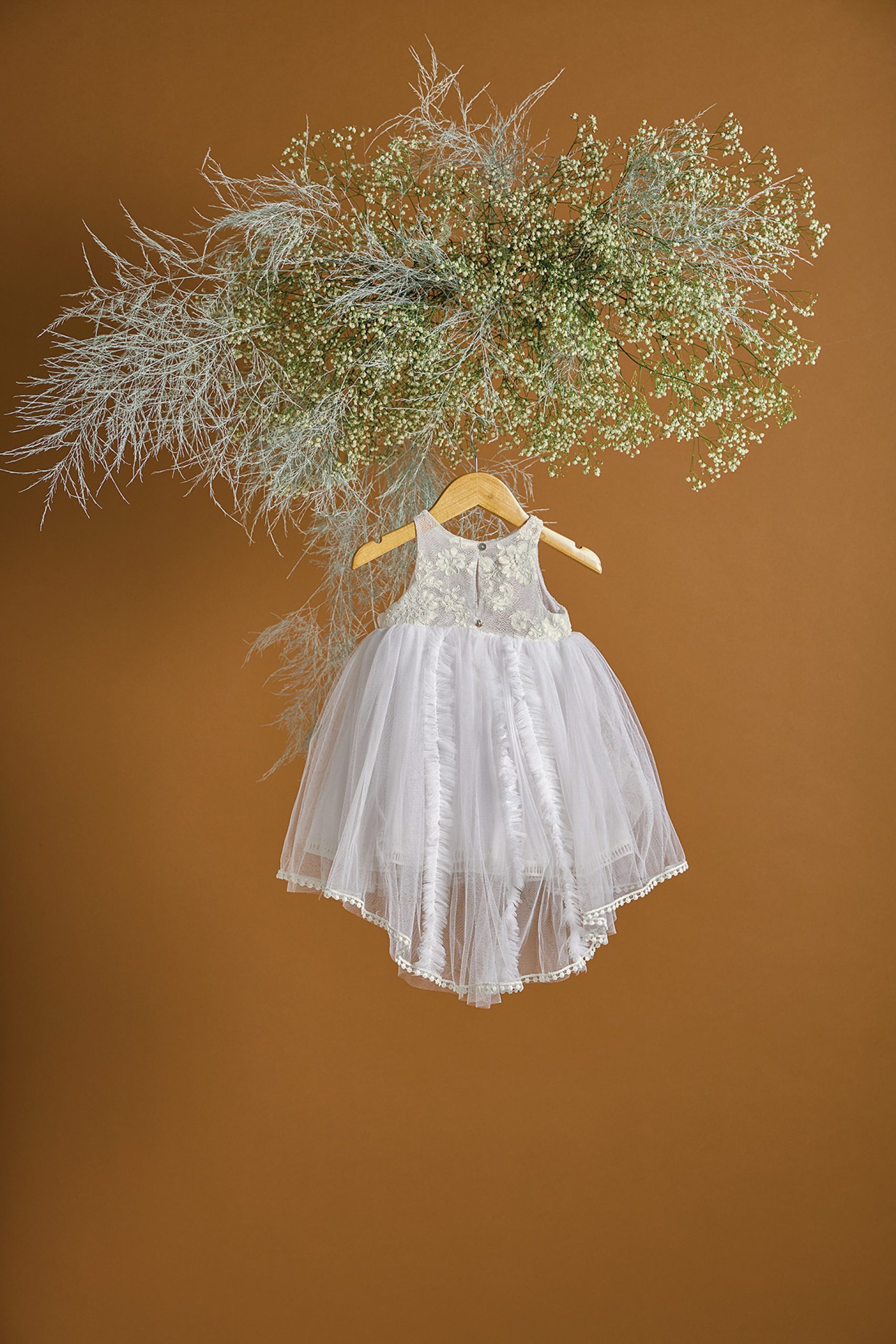Το συγκεκριμένο βαπτιστικό φόρεμα είναι μία ”clean” επιλογή για ένα ολόλευκο βαπτιστικό φόρεμα. Ο βουάλ λευκός φιόγκος στη μέση του φορέματος τονίζει την total white αισθητική του και μας οδηγεί στην επιλογή ενός ολόλευκου βαπτιστικού πακέτου. Συνδυάστε το με λευκή καπελιέρα με λευκό βουάλ φιόγκο ή ολόλευκο πομ-πον με τις ασσορτί δαντέλες του. Η χρήση των αποξηραμένων λουλουδιών σε συνδυασμό με τα τούλινα χειροποίητα λουλούδια δημιουργούν ένα βαπτιστικό πακέτο σε ολόλευκο χρώμα αλλά με αναπάντεχα συνδυαστικά στοιχεία. Για περισσότερη ένταση και όγκο χρησιμοποιήθηκε στη φούστα στο εμπρός και στο πίσω μέρος σουρωμένες τούλινες τρέσσες. Στην τιμή περιλαμβάνεται και η κορδέλα για τα μαλλιά.