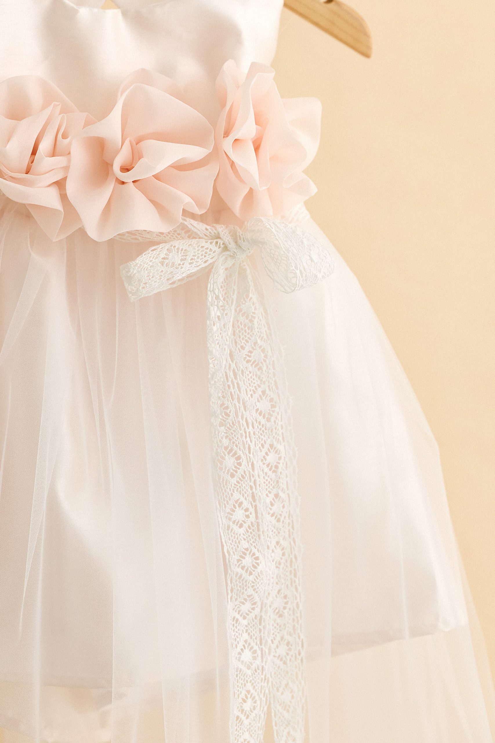 Ένα βαπτιστικό φόρεμα στο χρώμα της πούδρας και με στοιχεία που δημιουργούν μία πιο πλούσια εικόνα. Τα τρία μεγάλα λουλούδια πούδρας στο στήθος καθώς και η τούλινη μακρύα φούστα τονίζουν τη ρομαντική του αισθητική. Στο πίσω μέρος η πλάτη του είναια νοιχτή. Το παστέλ του χ΄ρωμα και ο αέρινος όγκος του μας επιτρέπουν αν συνδυαστεί με κάτι ρομαντικό σε παπουτσάκι όπως εκρού δαντελένια μπαλαρίνα. Συνδυάστε το με λευκή ντυμένη καπελιέρα και με λευκή-χρυσή πλακέ λαμπάδα με τούλι για να τονιστεί η ρομαντική του αίσθηση. Συνδυάστε το με εκρού τσάντα και μεγάλο φιόγκο σε εκρού ή χρώμα πούδρας.Στην τιμή περιλαμβάνεται και η τούλινη κορδέλα για τα μαλλιά.