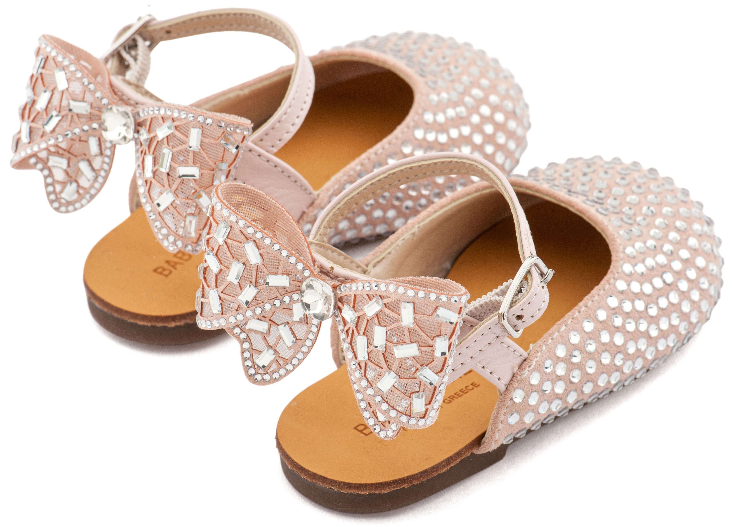 Δερμάτινο σαμπό διακοσμημένο ολόγυρα με στρας και φιόγκο από στρας στη φτέρνα, σε ροζ αντικέ χρώμα