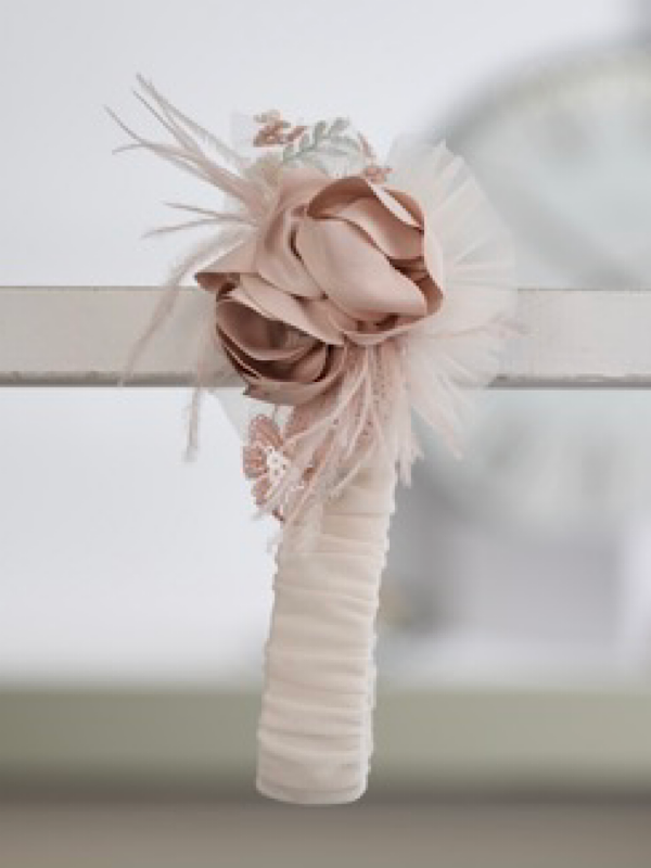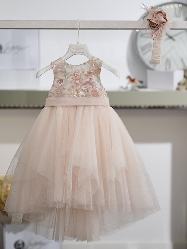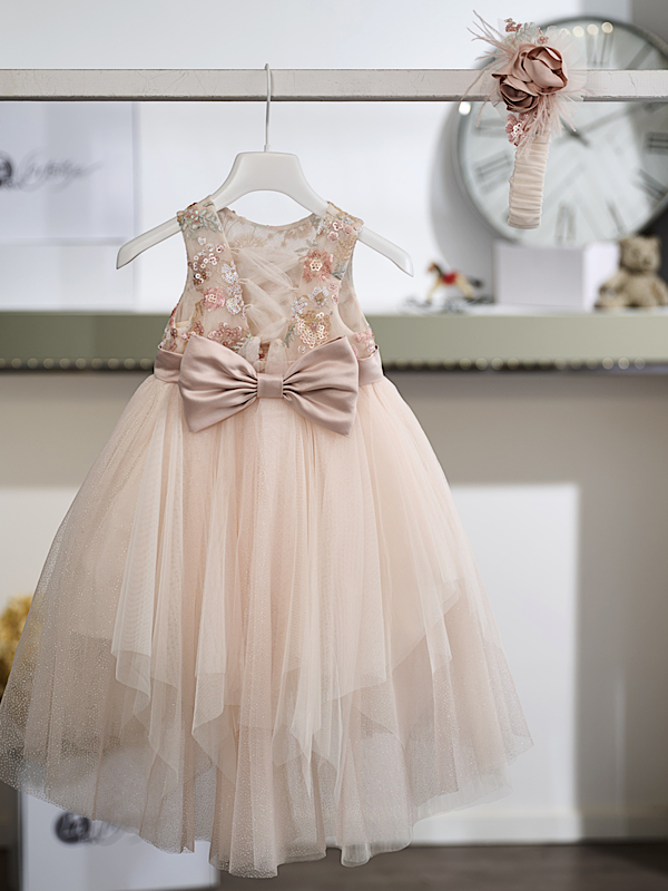 Το σύνολο ολοκληρώνεται με ασορτί κορδέλα μαλλιών σε σομόν τόνο, διακοσμημένη με τούλι, χειροποίητο λουλούδι και λαμπερές λεπτομέρειες, που συμπληρώνει αρμονικά την εμφάνιση