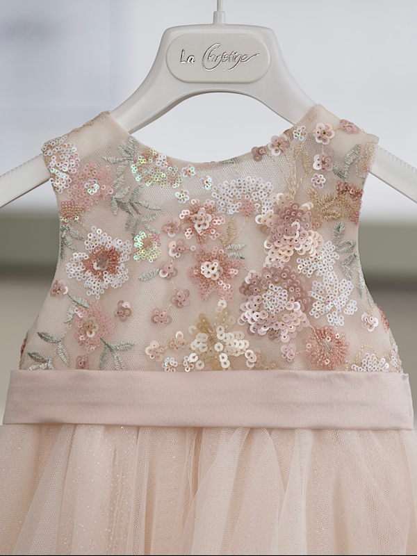 Η ρομαντική αισθητική και η διακριτική λάμψη συνδυάζονται αρμονικά σε αυτό το εντυπωσιακό βαπτιστικό φόρεμα σε σομόν απόχρωση, δημιουργώντας μια κομψή και φίνα εμφάνιση.