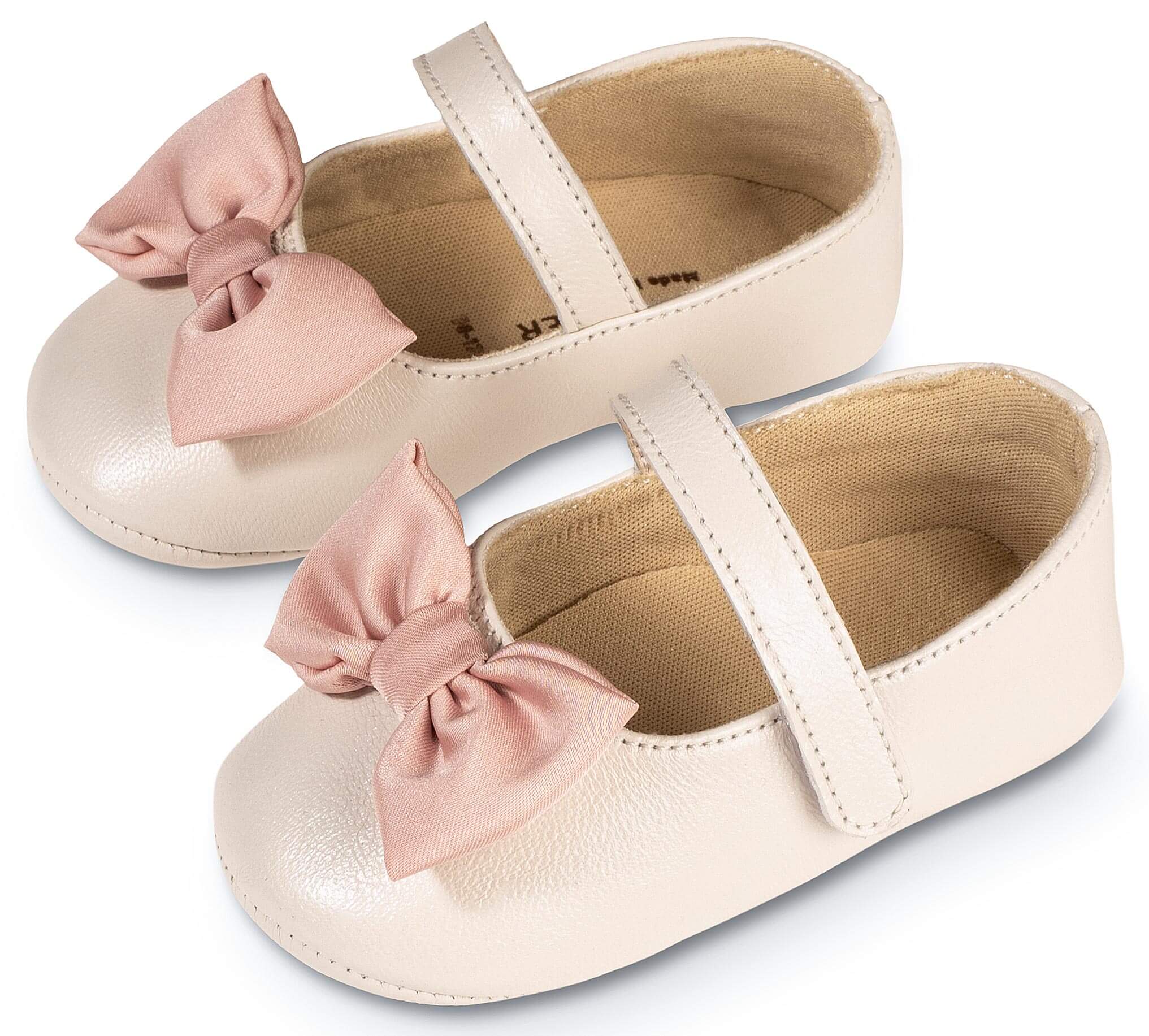 Δερμάτινο Γοβάκι Μονή Μπαρέτα με Υφασμάτινο Χειροποίητο Φιογκάκι σε Εκρού Ροζ Χρώμα