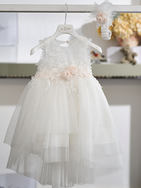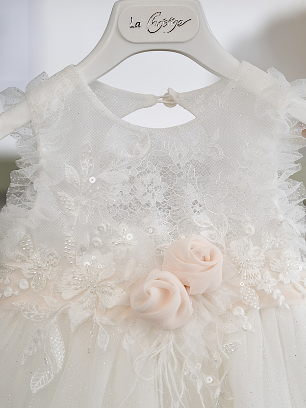 Η διαχρονική κομψότητα και η εκλεπτυσμένη αισθητική χαρακτηρίζουν αυτό το εντυπωσιακό βαπτιστικό φόρεμα σε off white απόχρωση.