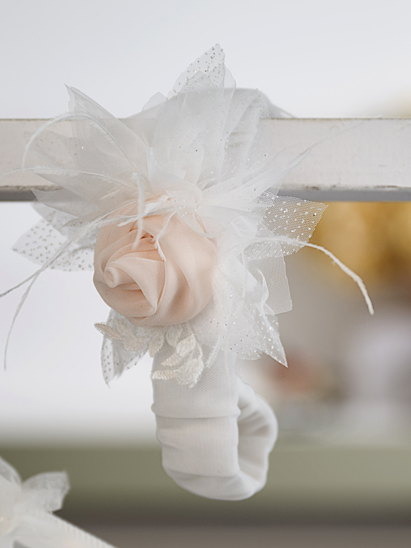 Το σύνολο συνοδεύεται από ασορτί κορδέλα μαλλιών με τούλι και χειροποίητο λουλούδι σε απαλό σομόν τόνο, που συμπληρώνει κομψά το σύνολο.