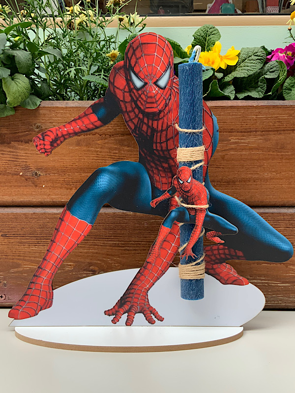 Χειροποίητη πασχαλινή αρωματική λαμπάδα Spider-Man σε ξύλινο διακοσμητικό ταμπλό με βάση .