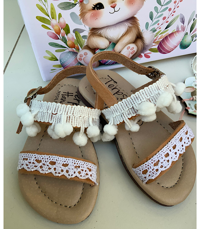 Πασχαλινό σετ για κορίτσι το οποίο αποτελείτε από δερμάτινα σανδάλια με λευκή δαντέλα και πον πον , πασχαλινή αρωματική λαμπάδα , βραχιολάκι με κουνελάκι δεμένο σε ξύλινο διακοσμητικό , σε υπέροχο πασχαλινό κουτί ! ! !
