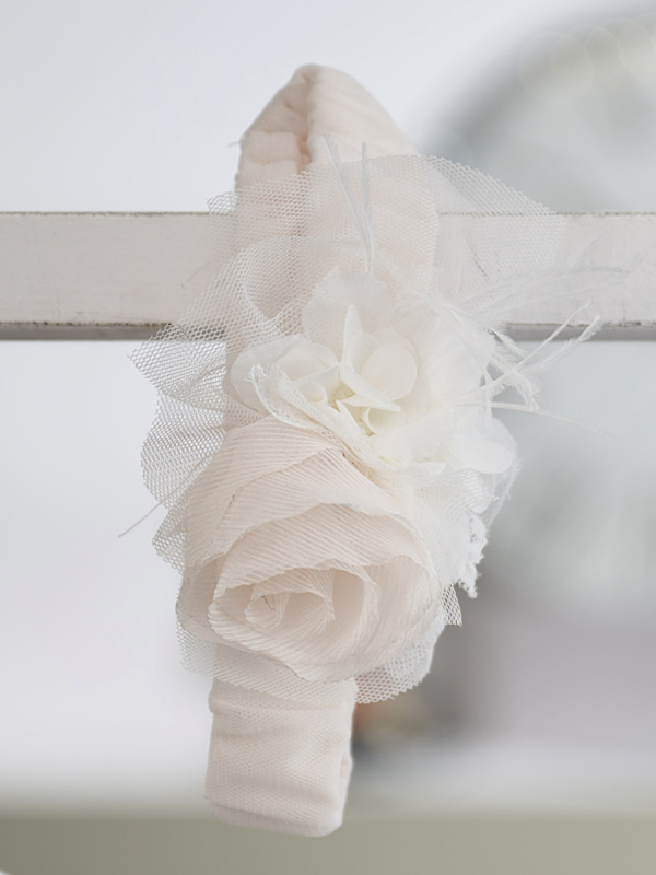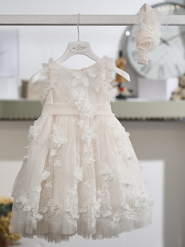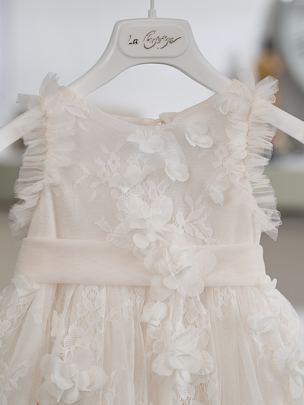 Το φόρεμα συνοδεύεται από ασορτί κορδέλα μαλλιών σε βανίλια τόνο, διακοσμημένη με τούλι και χειροποίητο λουλούδι, ολοκληρώνοντας αρμονικά την εμφάνιση.