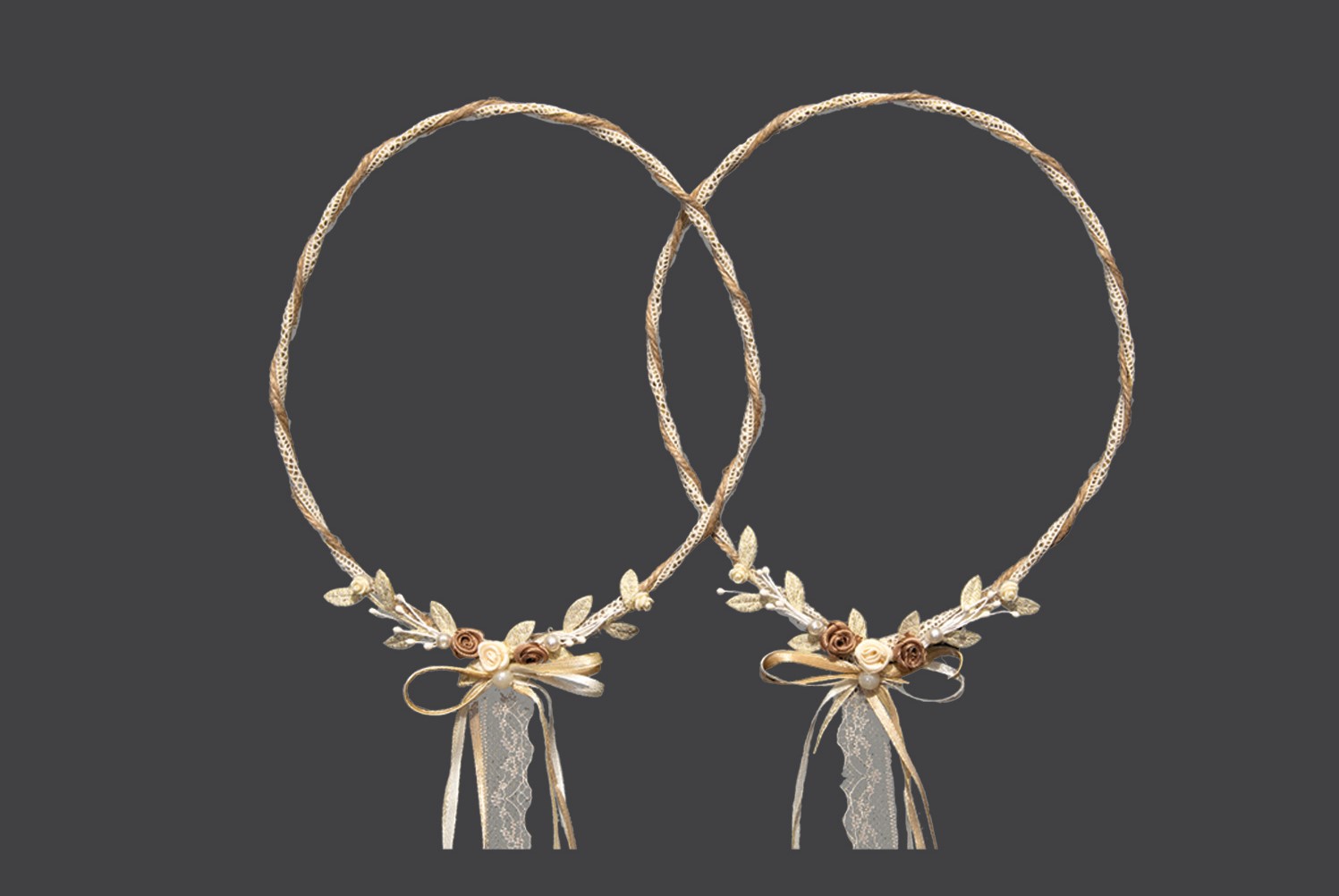 Στέφανα γάμου ρομαντικά διακοσμημένα με μόκα κορδόνια και μπέζ-καφέ λουλουδάκια.