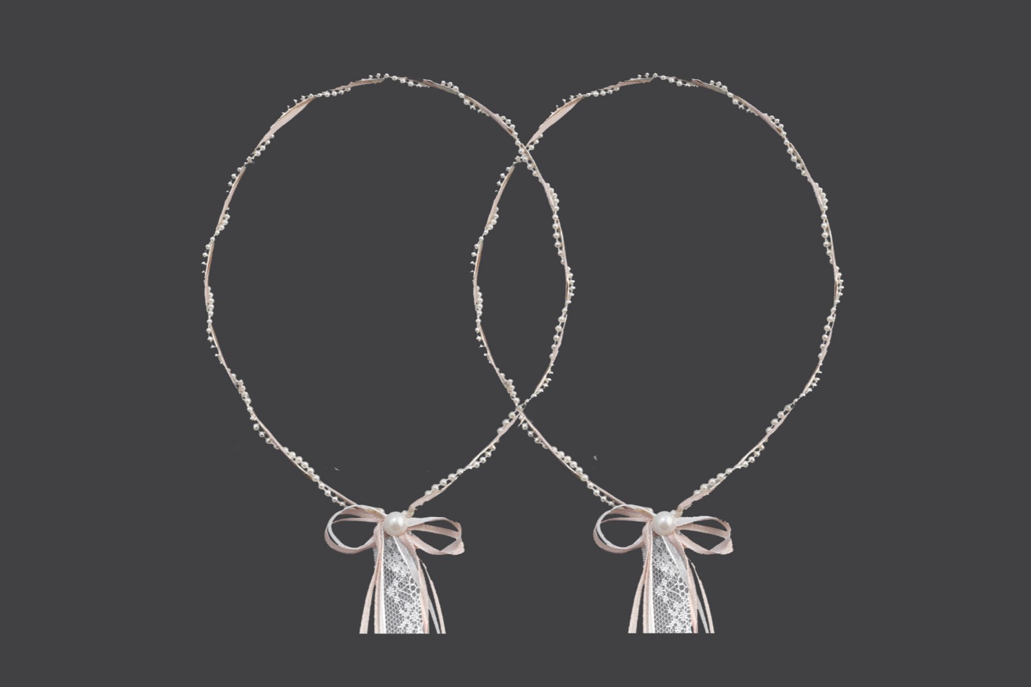 Στέφανα γάμου ρομαντικά. Αποτελείται από ασημί βέργα και είναι διακοσμημένα με σατέν κορδελάκι σε μόκα απόχρωση και τρέσα από μικρές πέρλες.